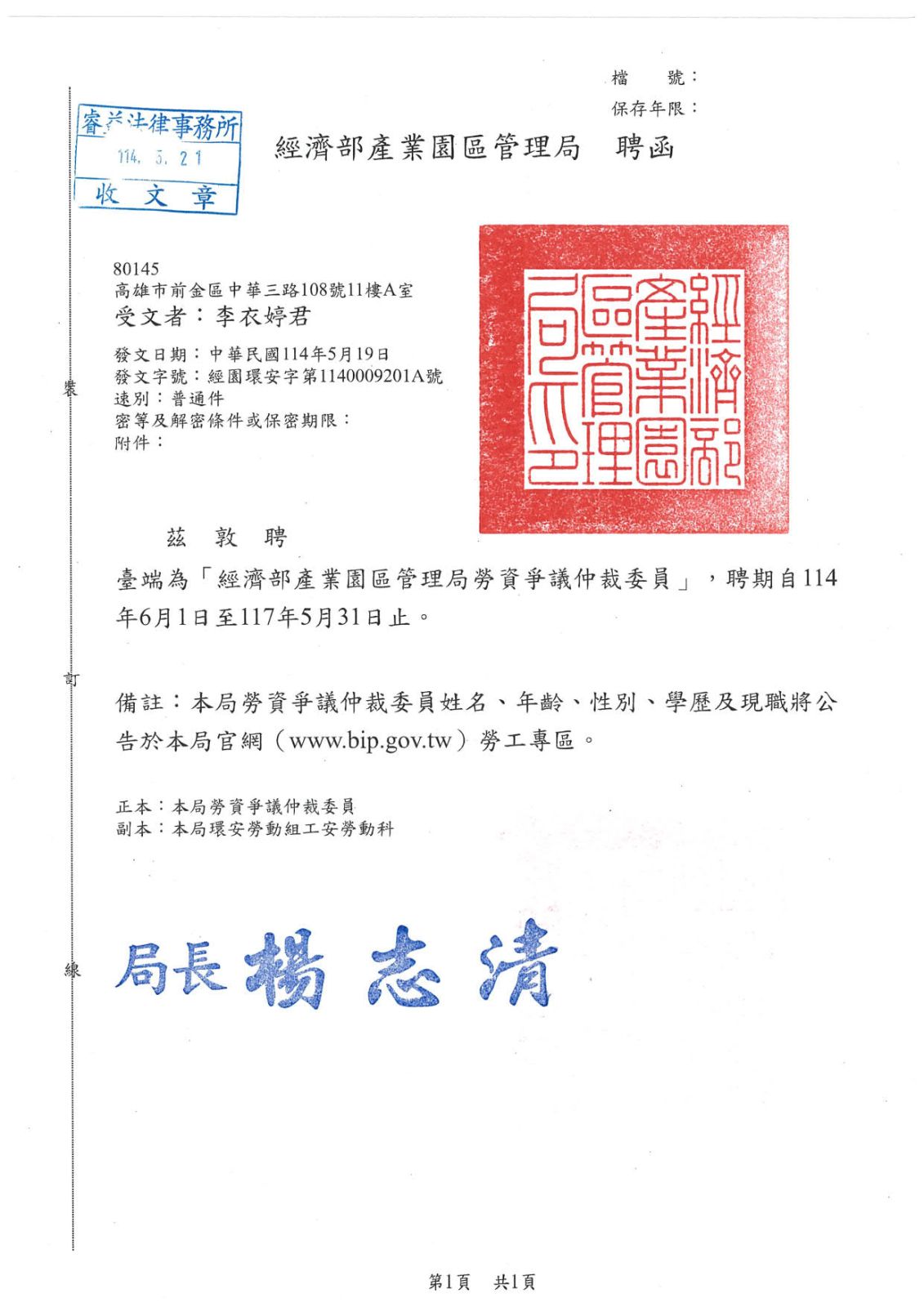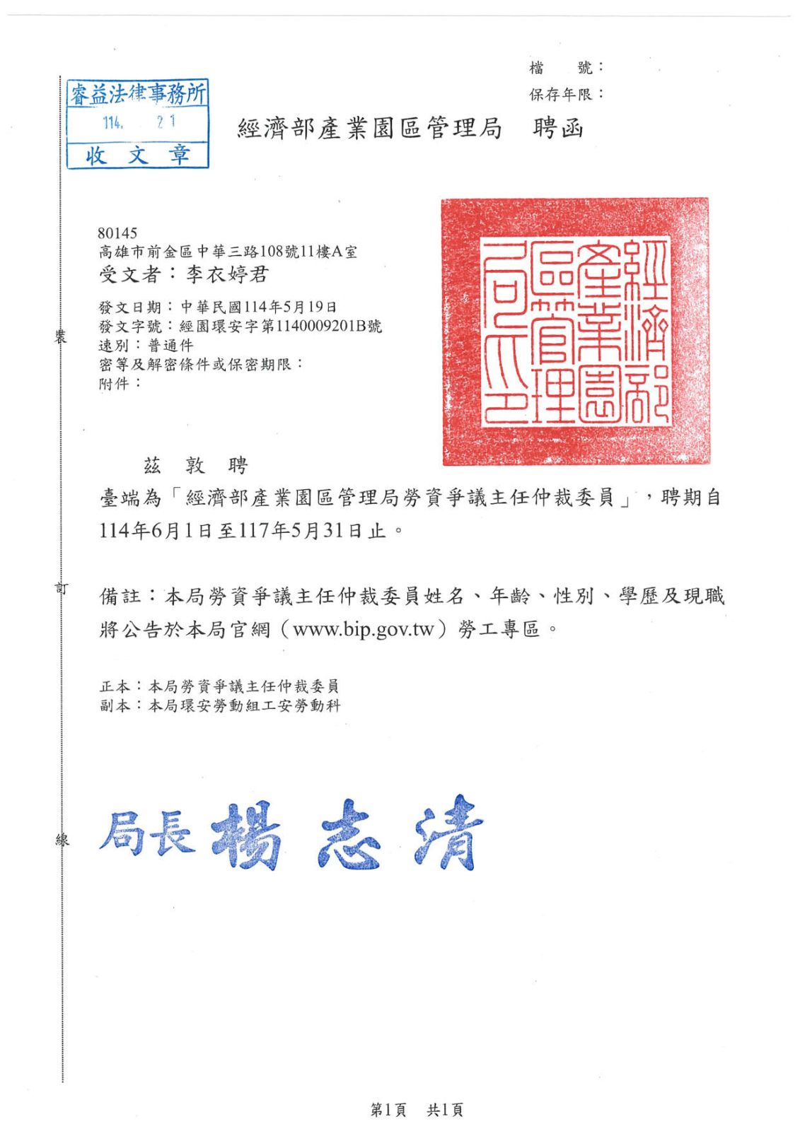李律師獲聘擔任經濟部產業園區管理局勞資爭議仲裁人、仲裁委員、主任仲裁委員!