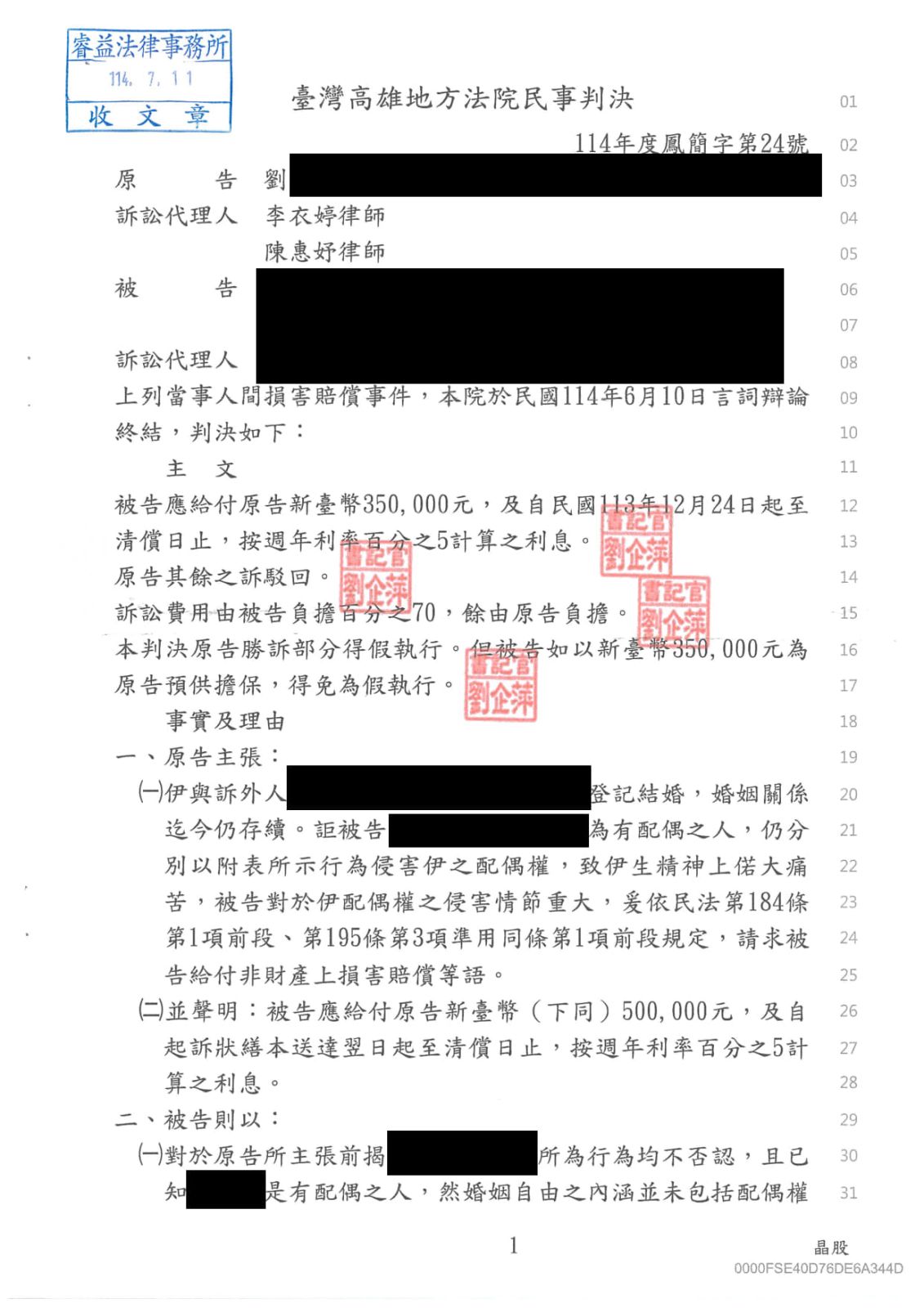 狂賀!本所協助劉小姐請求侵害配偶權事件獲得高雄地院勝訴判決!