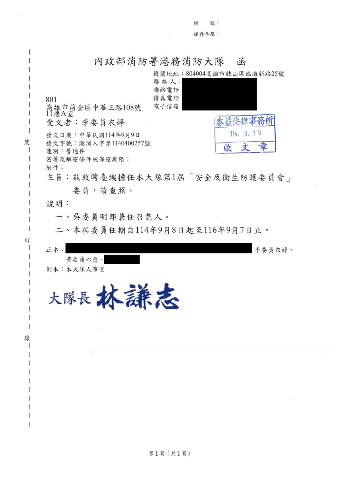 恭賀李衣婷律師獲內政部警政署高雄港務警察總隊聘任為安全及衛生防護委員會委員!