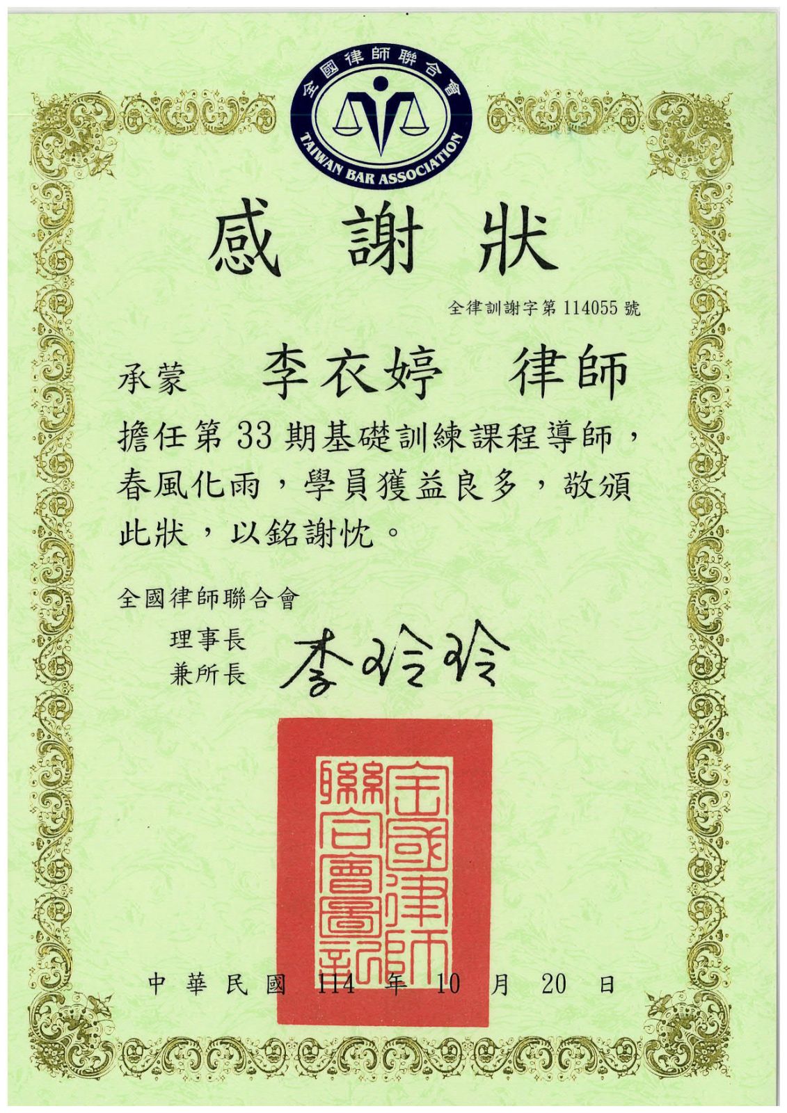 李律師擔任114年度第33期全律會律訓導師,與青年律師交換執業心得、鼓勵新任律師在法律路上披荊斬棘、守護人權,找尋自我的定位與價值,唯有不辭辛勞接受挑戰,方能從實習的過程獲得成就與進步,獲全律會表揚。