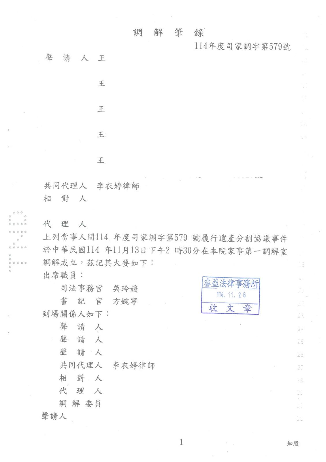 狂賀!本所代理繼承人王小姐就多年爭執不休之請求履行遺產分割協議事件成立調解!