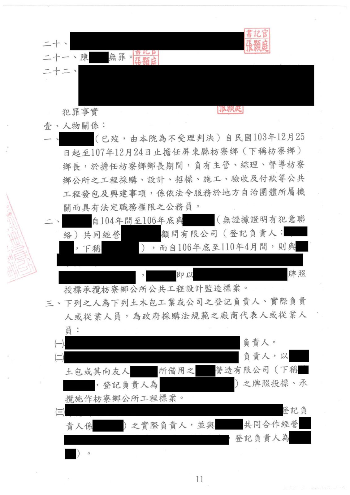 本案同案被告共計28名,為枋寮鄉公所內部弊案,廠商涉嫌圍標、陪標、借牌等違反政府採購法第87條第3項、第5項規定,廠商及公務員又分別涉及貪污治罪條例交付賄賂、收受賄賂等罪,本所協助內○土木包陳先生為刑事一審辯護程序,陳先生遭檢察官起訴涉犯借用他人名義或證件投標罪,經本所聲請傳喚若干證人,還原事實,證明陳先生的清白,為該案唯一獲無罪判決者。