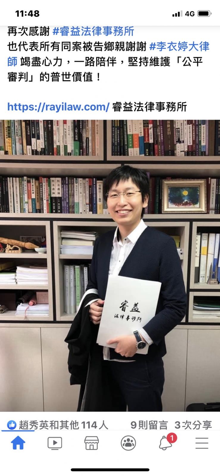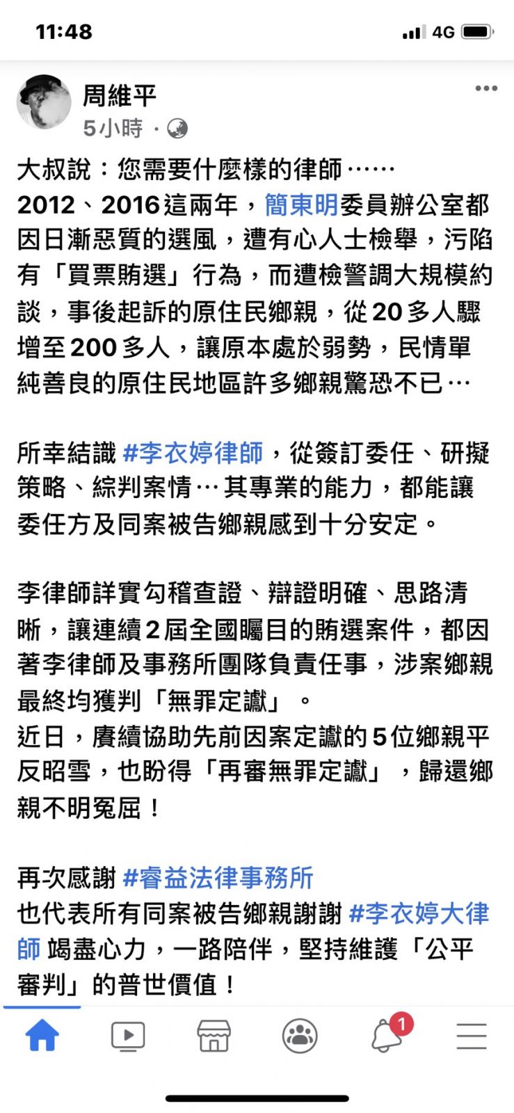 周維平先生為簡東明立委的特助,在109年10月30日FB發表以下貼文,感謝周先生和簡立委對李衣婷律師和睿益法律事務所團隊的支持和鼓勵。