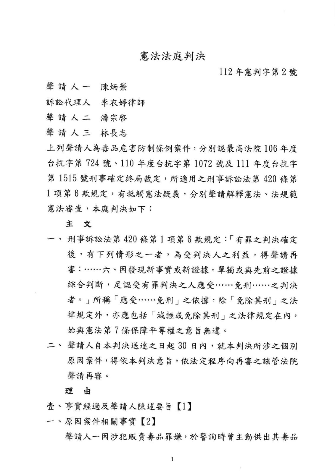 憲法法庭112年憲判字第2號判決為李律師擔任聲請人代理人之釋憲案件,此號判決將刑事訴訟法第420條第1項第6款之再審目標,放寬至包含實體法上若屬應免刑或減刑之規定,均可作為再審目標,得適用再審制度。常見案例為毒品危害防制條例第17條第1項:「犯第四條至第八條、第十條或第十一條之罪,供出毒品來源,因而查獲其他正犯或共犯者,減輕或免除其刑。」之情形。舉例而言,若受刑人所供出之上游,因通緝或無法遭緝捕到案製作筆錄,導致偵查機關遲遲無法查獲者,雖受刑人之本案判決已經確定,但若於判決確定後,確實因當初之供述而致檢調機關事後查獲該名上游(例如展開實質之調查手段、起訴或判決有罪等),則受刑人仍得以憲法法庭112年憲判字第2號判決作為再審之理由。備註:關於查獲之定義可參考下述論文。