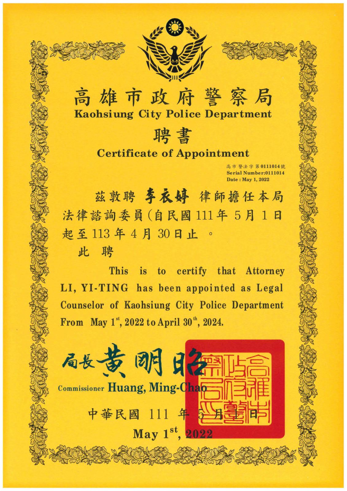 狂賀!李律師獲高雄市政府警察局續聘為法律諮詢委員!