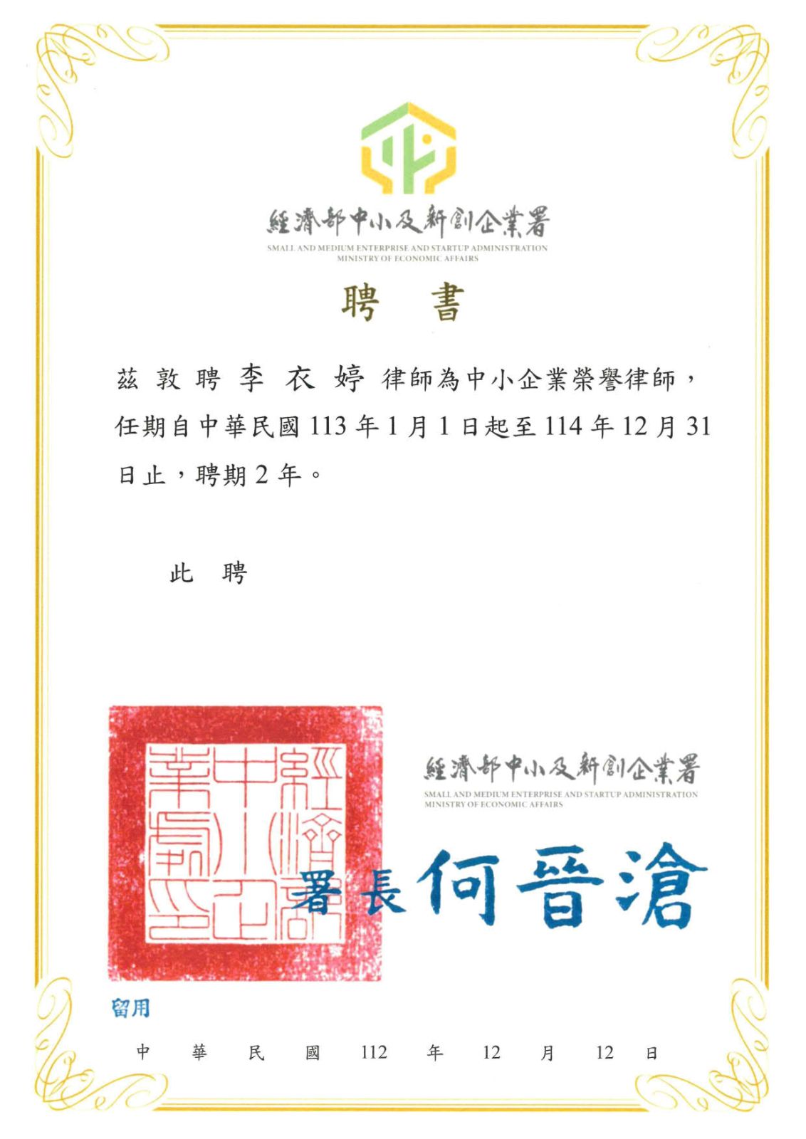 恭賀李衣婷律師獲經濟部中小及企業新創署續聘為榮譽律師!任期為113年1月1日起至114年12月31日。