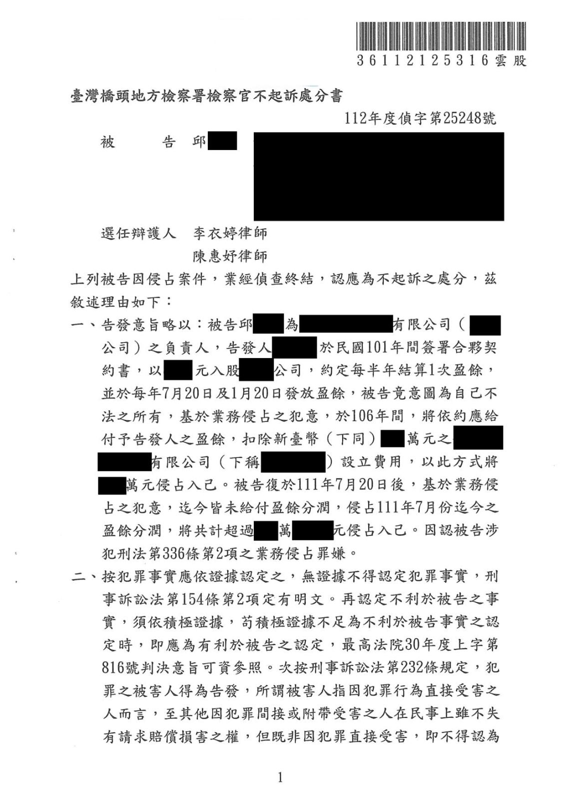 案號:橋頭地檢署112年度偵字第25248號(112.12.26)(個資均隱匿)
