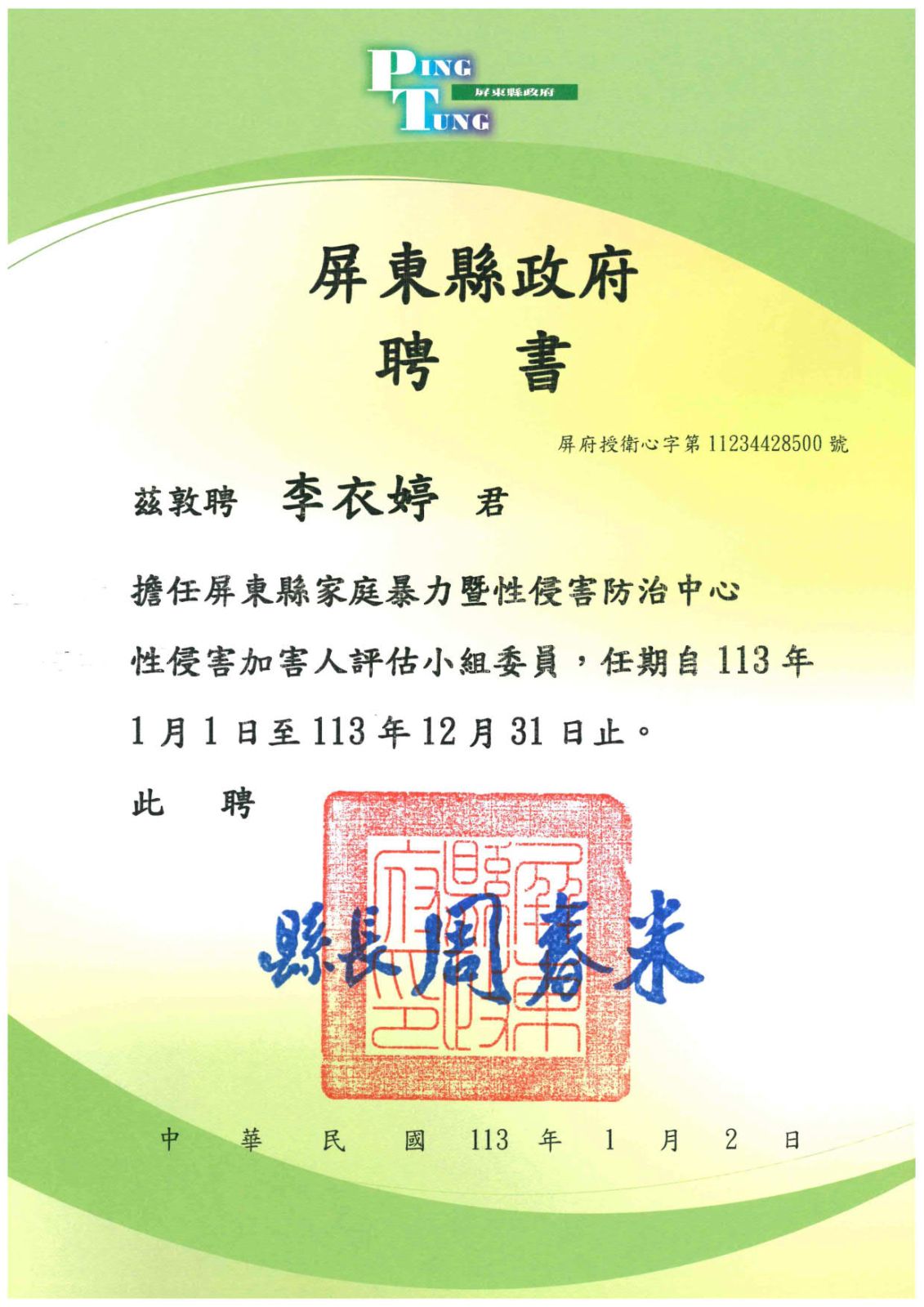 李律師於113年度獲聘為屏東縣家庭暴力暨性侵害防治中心性侵害加害人評估小組委員!