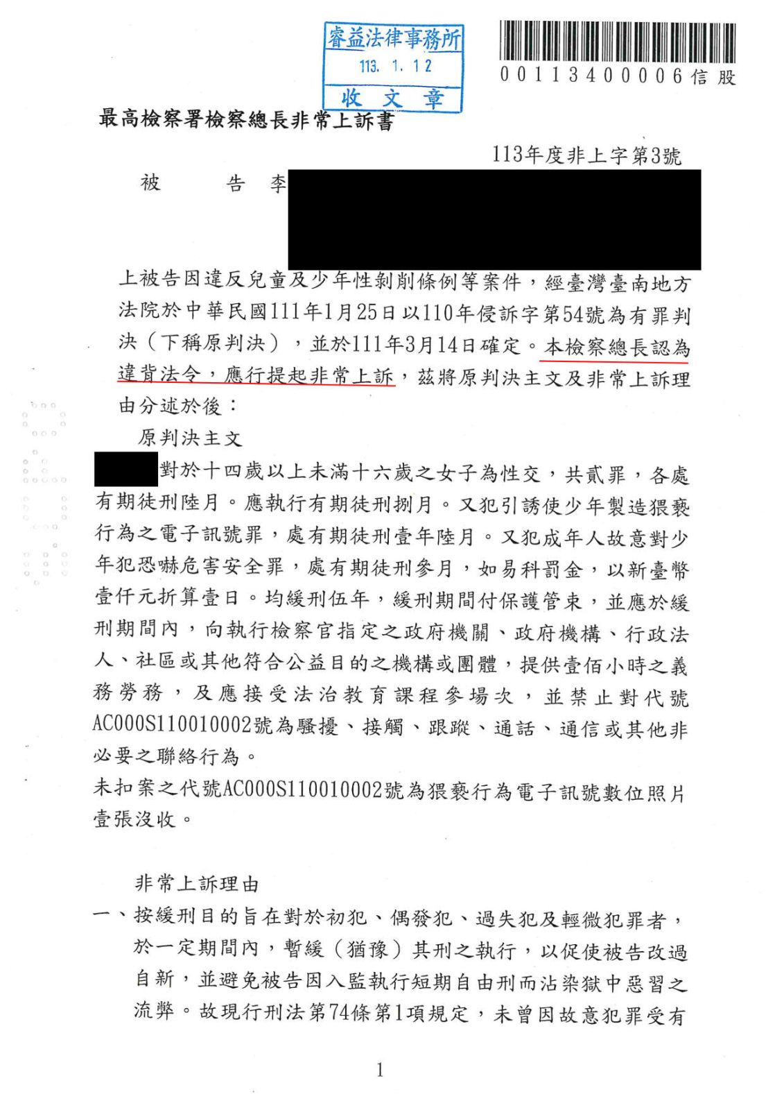 非常上訴成功機率極低,李律師憑藉長年法律專業、執業經驗,認為判決有違背法令之處,協助當事人聲請非常上訴,經最高檢察署檢察總長認為確定判決有違背法令之處,已於(113/1/12)向最高法院聲請非常上訴。
