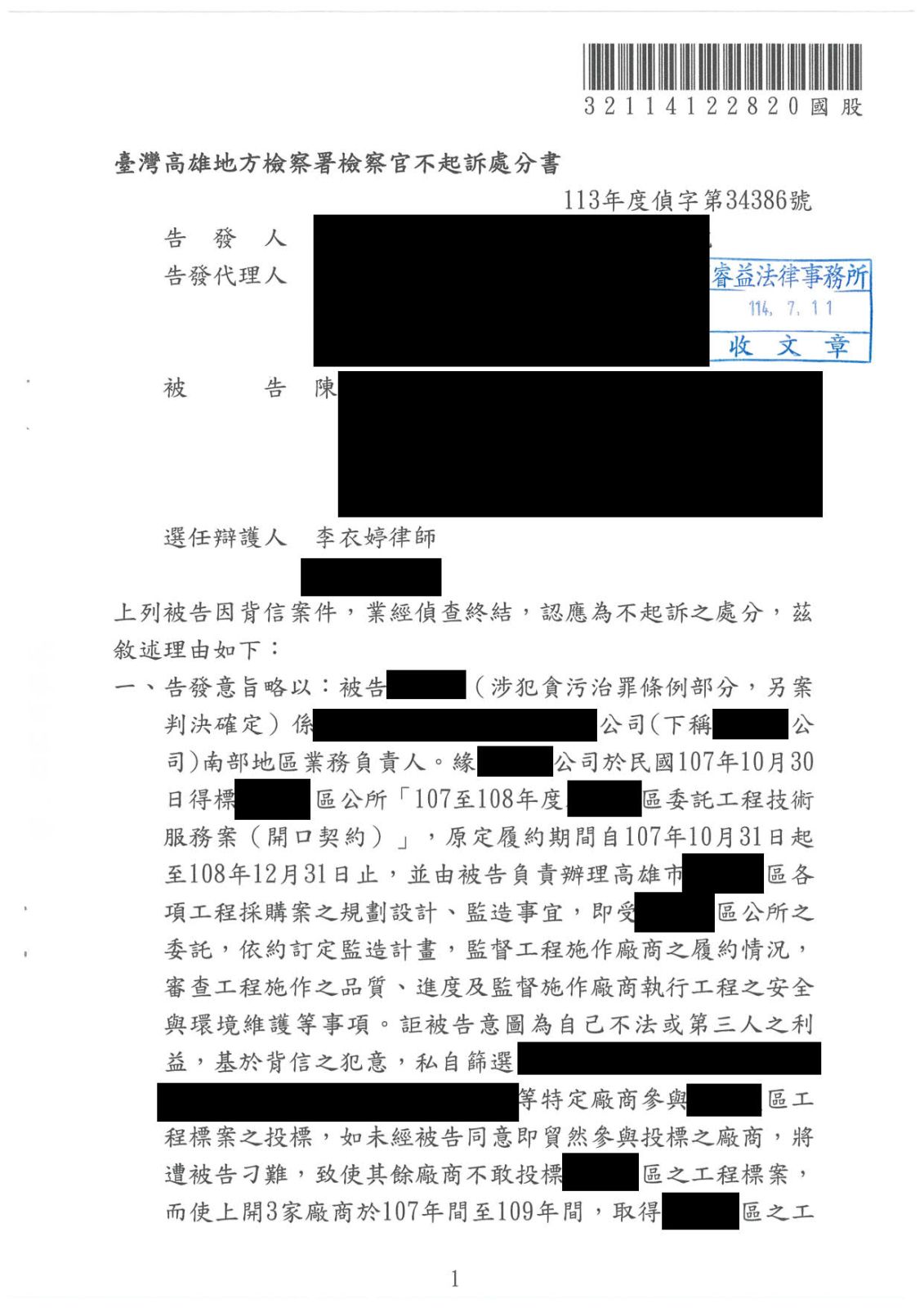 當事人陳先生為監造廠商,遭第三人提告涉犯背信罪嫌,委任本所為偵查中辯護,已獲高雄地檢不起訴處分!