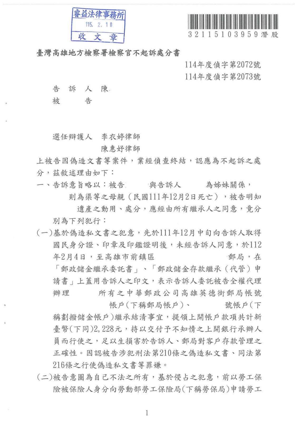案號:高雄地檢114年度偵字第2072、2073號不起訴處分(115.02.10)
